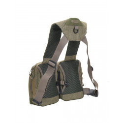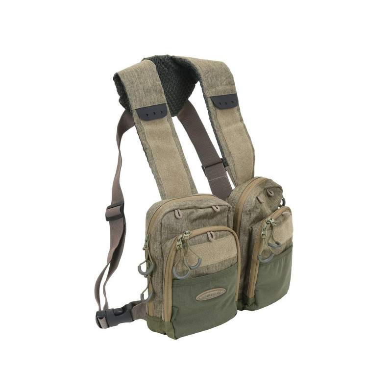 Cómodo y espacioso sistema de transporte con dos bolsillos. La parte frontal cuenta con dos compartimentos multifuncionales independientes que se pueden unir con cremallera o cinta elástica, según el ajuste deseado. La correa de hombro acolchada se ajusta perfectamente y la parte superior de las correas cuenta con velcro para sujetar los portaaccesorios extraíbles. En la parte trasera encontrará un clip para su sacadera. Los compartimentos principales tienen capacidad para una o dos cajas de moscas cada uno, y los compartimentos más pequeños permiten guardar cajas pequeñas o una gran cantidad de tippets, bajos de línea y otros accesorios.