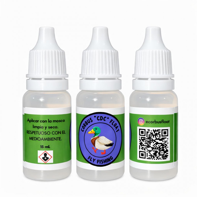 Su baja densidad permite que la pluma de CDC absorba perfectamente este producto y consigamos una flotabilidad increíble. Para la aplicación es MUY IMPORTANTE que la mosca esté bien seca y limpia. Para la aplicación, pondremos una gota de CORBUS FLOAT y le sacaremos el sobrante hasta que nos quede con un aspecto seco. En caso de ser usado después de una captura, lavar y secar bien la mosca y repetir el paso anterior si es necesario. (Más info en nuestros vídeos en Instagram @corbusfloat).